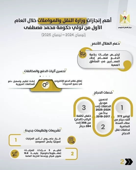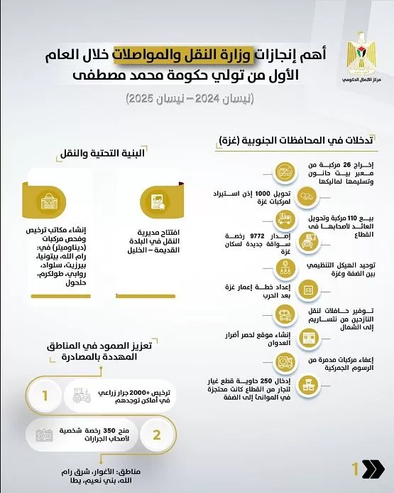 أصدر مركز الاتصال الحكومي، اليوم الاثنين، تقريرًا يُلخّص أبرز إنجازات وزارة النقل والمواصلات خلال العام الأول من تولّي حكومة محمد مصطفى (نيسان 2024-نيسان 2025)، كاشفًا عن سلسلة من التدخلات والإصلاحات التي نفذتها الوزارة على مستوى الضفة الغربية وقطاع غزة، في سياق تعزيز البنية التحتية للنقل، وتسهيل الخدمات، ودعم صمود المواطنين في المناطق المهددة.