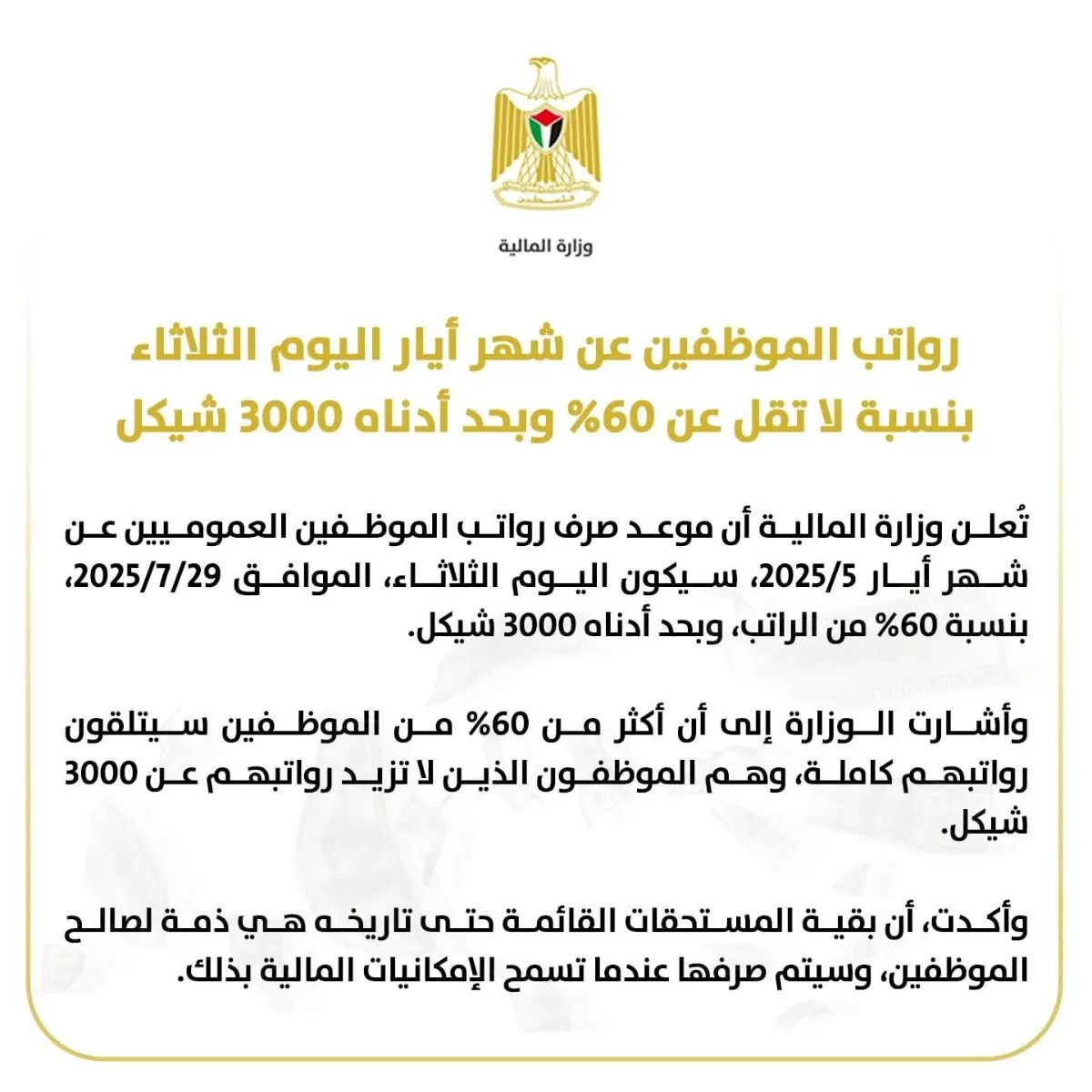 أعلنت وزارة المالية أن موعد صرف رواتب الموظفين العموميين عن شهر أيار 5/2025، سيكون اليوم الثلاثاء، بنسبة 60% من الراتب، وبحد أدناه 3000 شيقل.