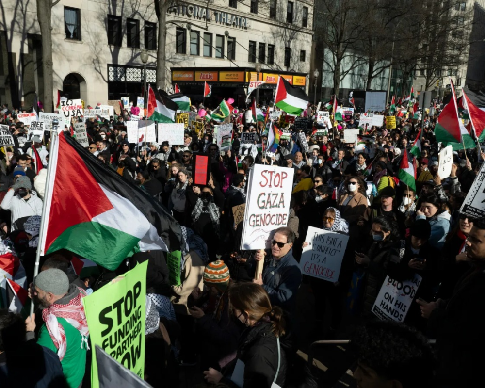 ورفع المتظاهرون الأعلام الفلسطينية ولافتات تطالب بإنهاء القصف الإسرائيلي على غزة، وفرض حظر أسلحة فوري من الولايات المتحدة على إسرائيل، معتبرين أن التدفق المستمر للسلاح يغذي "إبادة جماعية مستمرة".