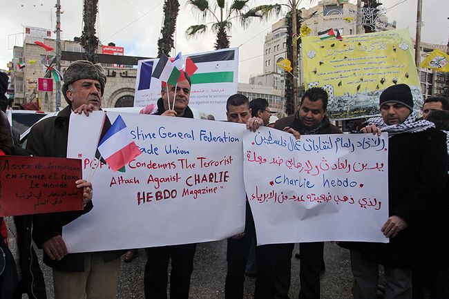 وكانت منظمة التحرير الفلسطينية ومؤسسات المجتمع المدني وبلدية رام الله دعت لتجمع وطني للتضامن مع فرنسا، شارك به محافظ رام الله والبيرة ليلى غنام، وأمين سر اللجنة التنفيذية لمنظمة التحرير ياسر عبد ربه، وعضو اللجنة واصل أبو يوسف، وأمين عام حزب الشعب بسام الصالحي، وأمين عام المبادرة الوطنية مصطفى البرغوثي، وأعضاء اللجنة المركزية لحركة فتح محمود العالول، ومحمد المدني، وعباس زكي، وأمين سر المجلس الثوري أمين مقبول، وأمين عام الجبهة العربية جميل شحادة، ورئيس ديوان الموظفين العام موسى أبو زيد، والناطق باسم الأجهزة الأمنية عدنان الضميري، ونقيب الصحفيين الفلسطينيين عبد الناصر النجار، وعدد من المواطنين والفرنسيين والأجانب.