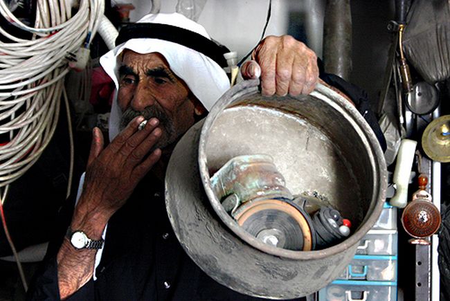 العامر لا يحب الصحفيين ولا الزوار العاديين، لكنه وبحكم مزاجه المتقلب، يتراجع فجأة عن صدهم، بالقفز إلى رفوف خشبية ملفوفة كالحزام على خاصرة القبو، ويبدأ بإحصاء أدوات المطبخ المرصوصة فوق الرفوف والتي استطاع حمار عائلته حملها في رحلة التهجير من قرية المنسي قضاء حيفا إلى جنين عام 1948.