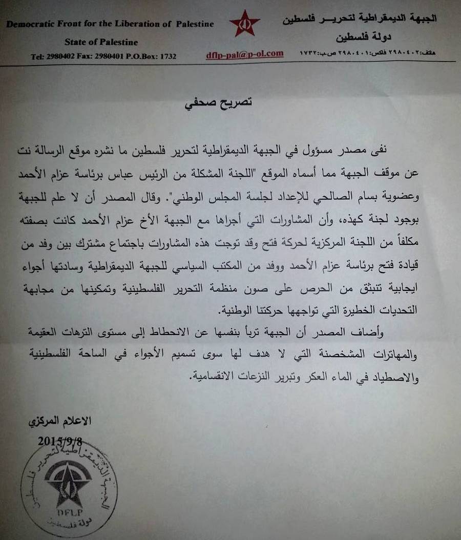 نفى مصدر مسؤول في الجبهة الديموقراطية لتحرير ما نشره موقع الرسالة نت عن موقف الجبهة مما اسماه الموقع اللجنة المشكلة من الرئيس عباس برئاسة عزام الاحمد وعضوية بسام الصالحي للاعداد لجلسة المجلس الوطني .