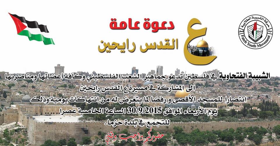 دعت الشبيبة الفتحاوية في فلسطين، جماهير الشعب الفلسطيني وأعضائها ومناصريها، الى المشاركة الواسعة والحاشدة في المظاهرات والمسيرات التي ستنطلق اليوم وغدا، من مراكز بعض المدن باتجاه نقاط المواجهة مع الاحتلال الاسرائيلي.