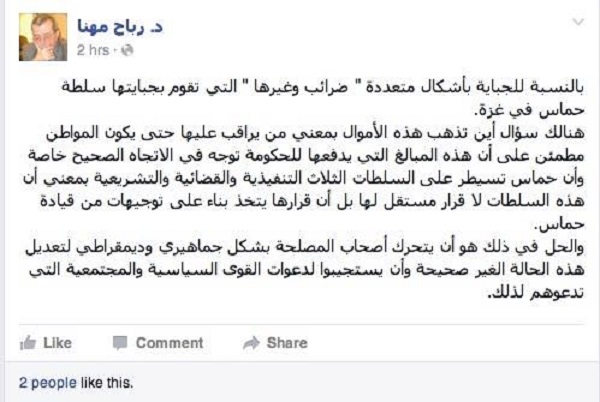 وقال مهنا في تصريح له عبر صفحته على الفيسبوك: "بالنسبة للجباية بأشكال متعددة "ضرائب وغيرها" التي تقوم بجبايتها سلطة حماس في غزة، هناك سؤال: "أين تذهب هذه الاموال بمعنى من يراقب عليها حتى يكون المواطن مطمئن على أن هذه المبالغ التي يدفعها للحكومة "الحمساوية" توجه في الاتجاه الصحيح خاصة وأن حماس تسيطر على السلطات الثلاث التنفيذية والتشريعي بمعنى أن هذه السلطات لا قرار مستقل لها بل أن قرارها يتخذ بناء على توجيهات من قيادة حماس".