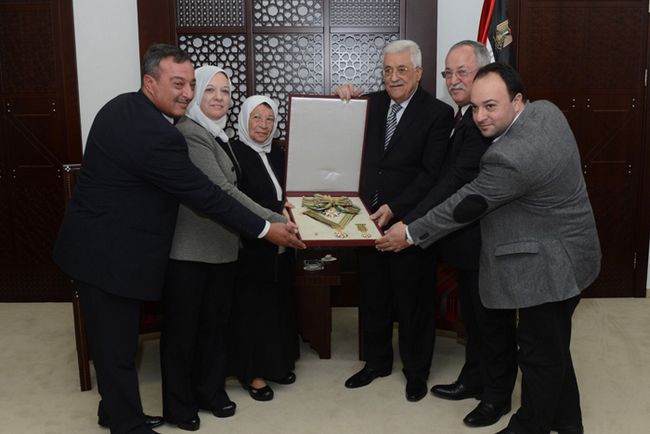 وتسلم الوسام من سيادته، في مقر الرئاسة بمدينة رام الله، مساء اليوم الاثنين، زوجة الشهيد وأولاده، وعدد من أفراد عائلته.