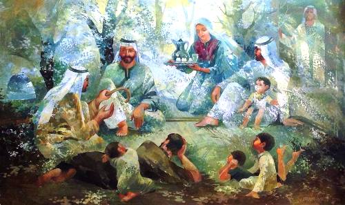 لم يتبقَ شيء من عادات وتقاليد وتراث فلسطين لم ترسمه ارينا.. جسدت الحياة في البيت والريف والإنسان الفلسطيني على طبيعتها، تمشي مع قارئ اللوحة بيئة فلسطين، تنقله بدهشة من موسم إلى آخر، عائلة فلسطينية من زوج وزوجة وأطفالهما يُشعلون ناراً في كانون الحطب 'الموقدة'، ويتجمهرون حولها طلبا للدفء وتبادل الحديث، بينما يصعد دخان من فوهة إبريق شاي حيث اعتاد الفلسطينيون أن يكون كانون الحطب مكانا ورمزا خاصا للبت في الأمور العائلية، ومجلس للنكات والمرح، الى رعي الماعز وحصاد القمح، كما رسمت قبة الصخرة المشرفة.