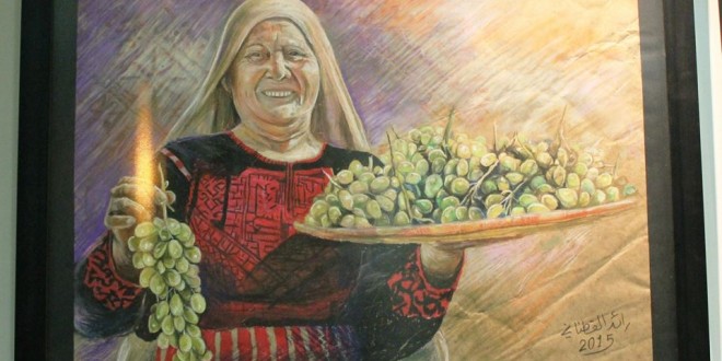 لوحات الأكف والأصابع: وهي مكونة من عشرين لوحة تعتمد كل لوحة على رسم أصابع اليد البشرية بشكل تشريحي دقيق، علماً أنني أرى أن تبيان أدق التفاصيل باليد البشرية يحتاج إلى مقدرة عالية وهدوء روح وصبر طويل، وفي هذه اللوحات كان الفنان يتحدث عن حكايات كثيرة تلامس الوطن وإن كانت الأصابع تشكل المحور الأساس فيها، ففي لوحتين نجد أصابع رجل كبير في السن تلتف حول العصا التي يتوكأ عليها، في إشارة واضحة للكهل وبخاصة أن أحد العصيّ هي ليست صناعية وإنما من أغصان الشجر، والتي نسميها باللهجة المحلية (الباكورة) بتضخيم الكاف، وهذا ربط مباشر بين فنية رسم الأصابع والفلاح الفلسطيني، بينما نجد ثلاثة لوحات لنساء كبيرات بالسن يرتدين الثوب الفلسطيني المطرز والمتميز بالإشارات الكنعانية التراثية واحتساء القهوة العامل المشترك بينها، وهنا إضافة إلى دقة رسم الأصابع نجد الإشارة للتراث الفلسطيني من خلال الثوب المطرز وعادة احتساء القهوة في جلسات النساء. وأذكر في طفولتي المبكرة حين كانت تجتمع نسوة الحي مع المرحومة والدتي ويحتسين القهوة، بينما في سبعة لوحات أخرى كانت الأصابع والأكف تصور حياة المرأة الفلسطينية، وهي ترتدي زيها التقليدي وتمارس التطريز الفلسطيني والزراعة وصناعة القش وقطاف الزيتون ونسيج الصوف، وهكذا نرى أن الكف والأصابع التي شكلت عموداً فقرياً في لوحات الفنان كانت تحمل فكرة الوطن من خلال الحياة بأشكالها المختلفة، ولم يبتعد الفنان أيضاً عن فكرة الحياة واستمراريتها من خلال رسم الأكف والأصابع في خمس لوحات، منها ثلاث لوحات تصور التقاء كف كبيرة مع كف طفل في إشارة لاستمرارية الحياة جيلاً إثر جيل، بينما لوحة واحدة كانت الأكف الكبيرة تحتضن قدم طفل صغير وأخرى تحمل فرخي طير بين الكفين، فتواصلت فكرة الأكف والأصابع بدقتها التشريحية مع دورها في الحياة اليومية حتى فكرة الحياة وتولدها واستمراريتها، حتى يوصلنا الفنان إلى كف المرأة بزيها التقليدي وهي تحمل المفتاح رمز العودة، لينقلنا بعدها إلى اليد المقاومة الشابة التي تحمل الحجر ويلتف حولها غص الزيتون وكأنه ينبت منها، في رمزية واضحة لربط المقاومة بفلسطين من خلال الزيتون من جهة، وأن المقاومة تهدف إلى الحرية وحياة ينيرها السلام بعدها وليس المقاومة العبثية، ويكمل الفكرة بالكفين الكهلين يحملان المسبحة بصمت وهدوء.