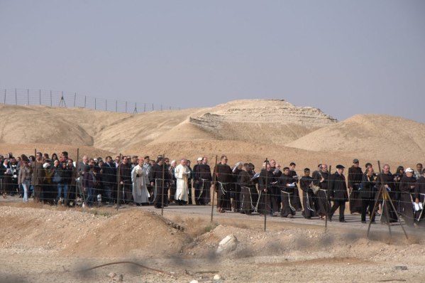 وبعد قطع المسافة مشيا على الأقدام ترى افواجا من المسيحيين، تهم بالوصول الى ضفة النهر الغربية حتى الدخول الى مساحة امتلأت بالحجاج، الذين جاءوا من شتى بقاع العالم للتعميد في مياه نهر الاردن، وإقامة الصلوات والقداس في المكان.