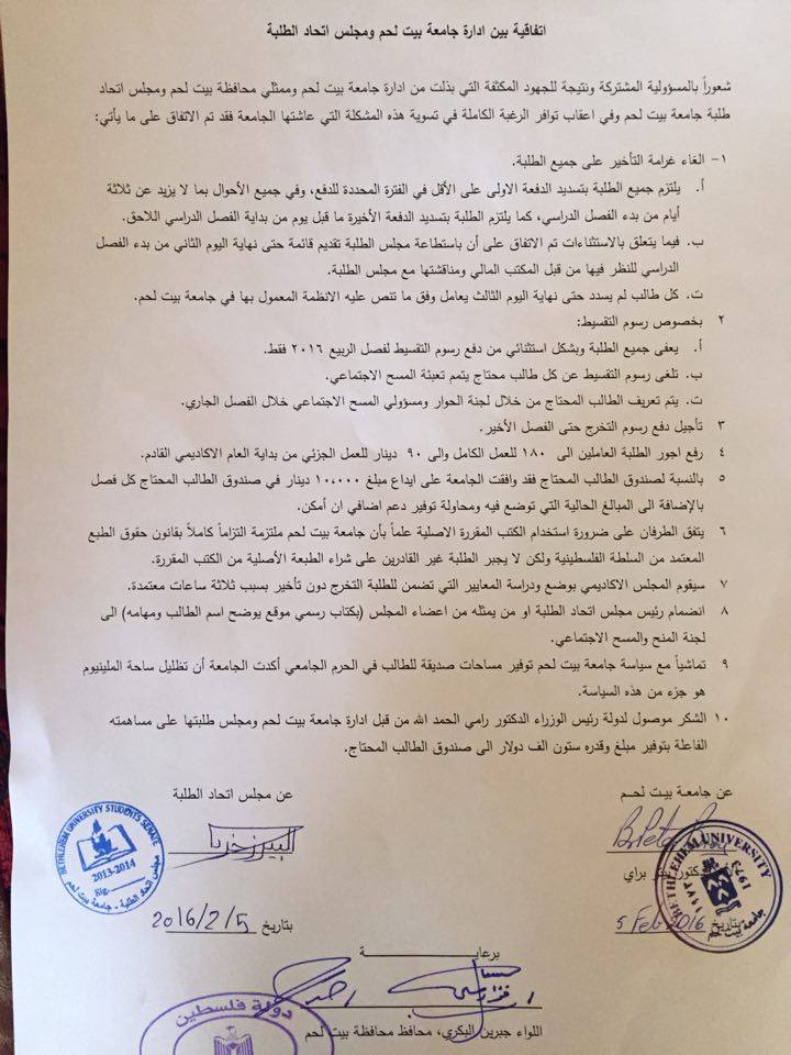 وجاء في الاتفاق: "تماشيا مع سياسة جامعة بيت لحم توفير مساحات صديقة للطالب في حرم الجامعة، أكدت الجامعة أن تظليل حرم ساحة وقاعة الملينيوم هو جزء من هذه السياسة".