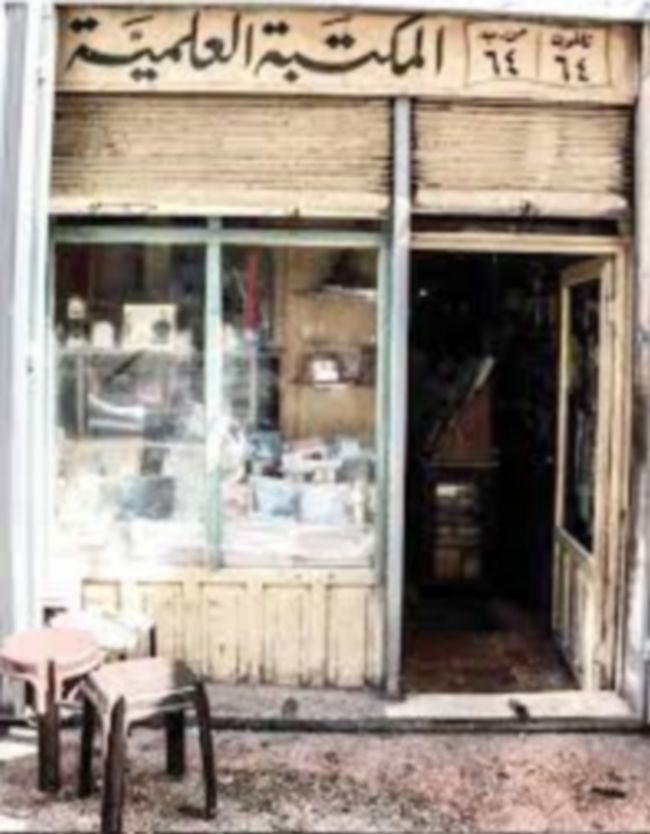 على الجانبين بنايات تجارية ومحال منفردة متلاصقة، تتوسط المسافة بين البنايات ذات الطوابق المتعددة، غرفة بحجم ستة أمتار طول، وأربعة عرض، في سقفها سدة، على الواجهة فوق باب زجاجي عتيق كُتب: المكتبة العلمية تلفون 64 ص.ب: 64، يمر عنه الطلاب في طريقهم إلى مدارسهم يشترون قرطاسيتهم وحاجياتهم المدرسية، تعرفه الأمهات اللواتي يهدين أطفالهن قصصًا وحكايات، قراء الصحف اليومية والمجلات المتنوعة.