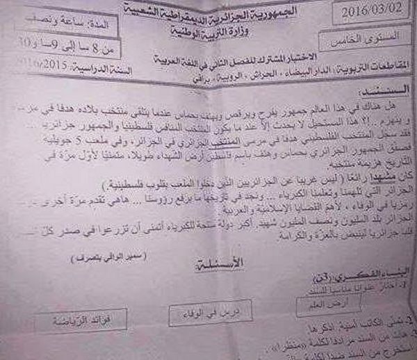 أعدت وزارة التربية الوطنية الجزائرية عبر امتحان اللغة العربية لتلاميذ الصف الخامس أبتدائى للمرحلة الأساسية فى ثلاث مقاطعات ولائية مدخلا لورقة الامتحان يتناول مباراة المنتخب الاولمبي الجزائري مع المنتخب الوطني الفلسطيني "الفدائى" وجاء فى مدخل ورقة الامتحان سؤال حول معنى الانتماء الحقيقي للقضية الفلسطينية وعمقها التاريخي والنضالي مع الجزائر الشقيق بلد المليون ونصف مليون شهيد ,من خلال تشجيع الجزائريين للمنتخب الفدائى الفلسطيني على حساب منتخبهم الوطني والتي تعد هي الظاهرة الأولى من نوعها على المستوى الرياضي العالمي بأن يقوم مواطني الدولة بدعم وتشجيع منتخب "الخصم الرياضي" الشقيق.