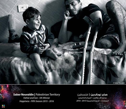 "لم يمكنني الحصار المفروض على قطاع غزة من حضور الحفل الختامي لإعلان أسماء الفائزين بجائزة الشيخ حمدان بن محمد الدولية للتصوير الضوئي، لحظة كان اسمي "صابر نور الدين" من فلسطين، يتردد على منصة توزيع الجوائز، كنتُ نائمًا، لجأت إلى ذلك لشعوري بالإحباط بعد عدم تمكني من السفر، قبل أن يجتمع الأهل والأقارب والأصدقاء فوق رأسي للاحتفال بحصولي على المركز الخامس في "محور الأب والابن" للدورة الخامسة من الجائزة والتي حملت عنوان "السعادة"، يقول المصور الصحفي صابر نور الدين.