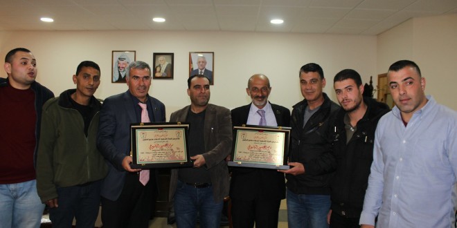 وكرم الوفد في ختام اللقاء المهندس سامر الشيوخي، والاستاذ ناصر الشيوخي، بتقديم الدروع لهما، نظير جهودهما في دعم الطلبة الذين يواجهون صعوبات مالية تحول دون التحاقهم بالتعليم العالي.