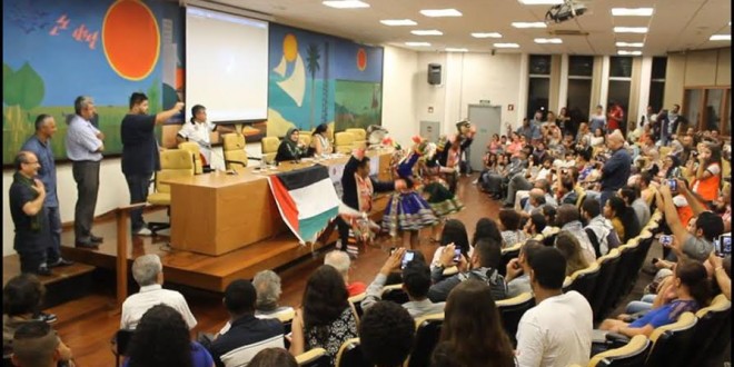 ابتدأ الحفل بالنشيدين الوطني الفلسطيني والبرازيلي، ومن ثم تم عرض فيلما وثائقيا عن يوم الارض الفلسطيني واحداثه عام 1976.