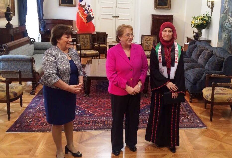 وأثنت رئيسة تشيلي خلال اللقاء، الذي جرى بحضور وزيرة التربية التشيلية أدريان دلبيانو، وسفير دولة فلسطين عماد الجدع، وعضو المجلس الثوري لحركة فتح عمر الحروب، ورئيس النادي الفلسطيني موريس خميس، وممثل مؤسسة "فلسطين 2000" في تشيلي اليكسيس صفير، على الحروب والإنجاز الذي حققته، معتبرة إياها نموذجا للشعب الفلسطيني، وقدرته على تحدي كافة الصعاب.