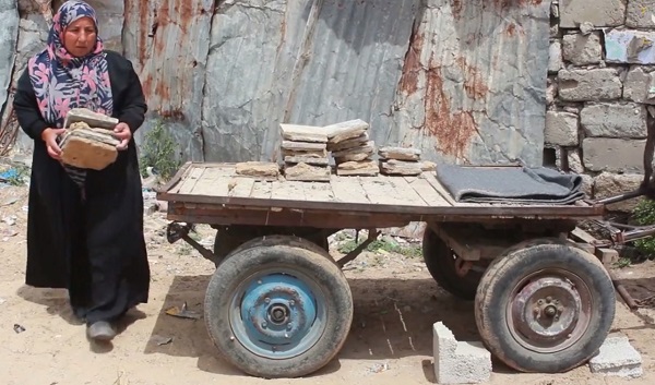 ام كريم وهي تكفف الدمع عن عينيها قبل ان يسقط ويهزم كل هيبتها وقوتها التي منحتها اصرارها وعزيمتها، فقد كانت تتألم بصمت وتختبئ خلف اسوار الابتسامة التي نزعت من سنوات عديدة تقول: "انها تستيقظ في الصباح الباكر لجمع بعض الحجار والركام على عربتها (الكارة) ليتم بيعها لمعامل صناعة الحجارة مقابل دولارين على العربة الواحدة فتعيل بهما أبناءها (محمد وكريم) وزوجها المسن المريض".
