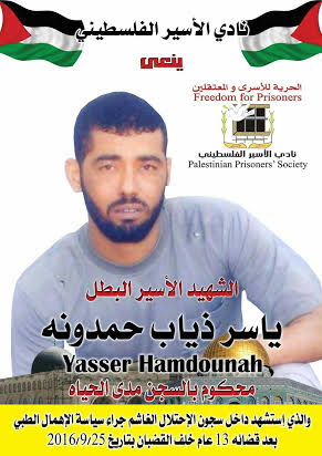 نعى ذوو الأسرى في محافظة طولكرم شهيد الحركة الأسيرة ياسر حمدوني، الذي استشهد في سجن ريمون بسبب الإهمال الطبي.