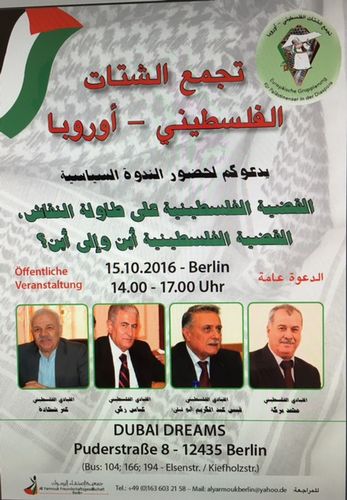 وذلك يوم السبت الخامس عشر من تشرين الأول / أكتوبر الجاري، في العاصمة الألمانية برلين في قاعة " أحلام دبي " بدءً من الساعة الثانية عشرة بعد الظهر، بحضور ومشاركة كل من النائب قيس عبدالكريم أبو ليلى نائب الأمين العام للجبهة الديمقراطية لتحرير فلسطين، والقائد الوطني محمد بركة رئيس لجنة المتابعة العليا لشؤون الجماهير العربية في الداخل عام 48 ، والقيادي عباس زكي عضو اللجنة المركزية لحركة فتح، وعمر شحادة عضو المجلس المركزي الفلسطيني.