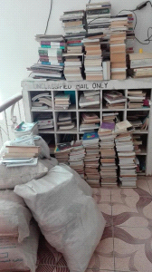 الكل متاح، حيث لا وجود للرفوف، بل هناك أكوام وكراتين وأكياس؛ لضيق المكان الذي أسكن فيه. أتمنى أن يلمس أحد من العائلة الكتب ويقرأ، ولكن مع الأسف لا تعني أحد.