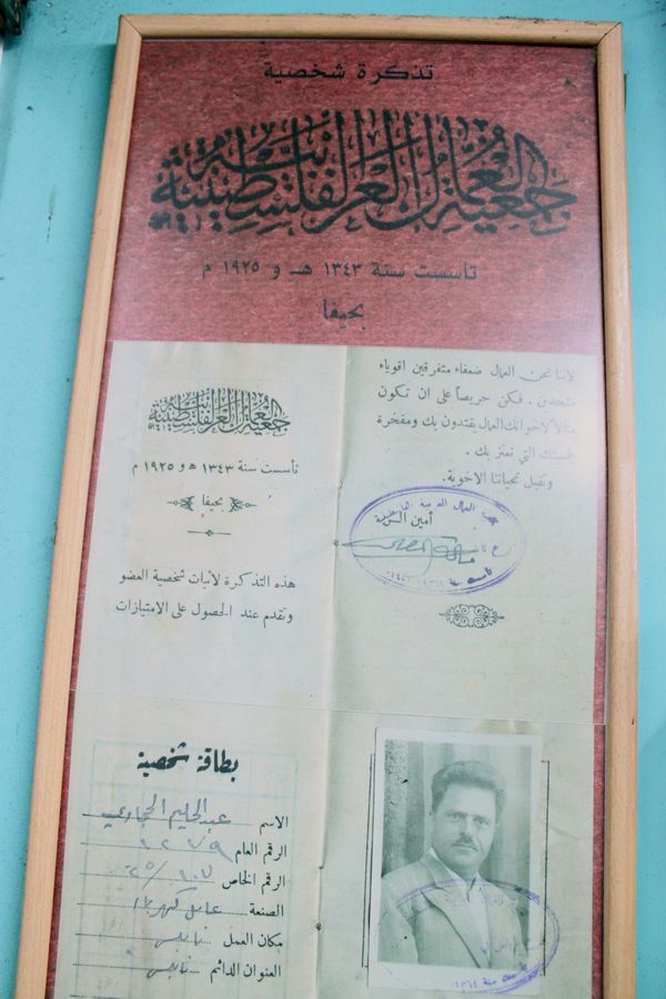 في شارع فلسطين وسط مدينة نابلس لا يشد انتباه جميع المارة لوحة معلقة على مدخل محل للإلكترونيات، احتفظ خلف زجاجها أصحاب المحل بأوراق ووثائق تثبت انتساب جدهم إلى جمعية العمال العربية الفلسطينية التي تأسست عام 1925 في مدينة حيفا باعتباره عامل كهرباء.