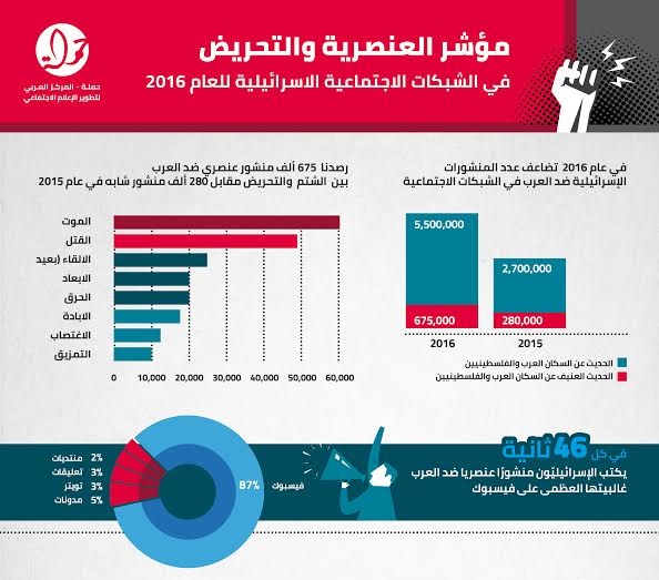 ويكشف البحث أن 60 ألف متصفح إسرائيلي كتبوا على الإنترنت منشورًا عنيفًا واحدًا على الأقل ضد العرب، حيث وجد 675000 منشور عنصري أو تحريضي كتب ضد العرب على الشبكات الاجتماعية في العام 2016، بمعدل منشور كل 46 ثانية، غالبيتها على "فيسبوك"، أي ضِعف ما كان عليه العدد في عام 2015، والذي نشر فيه 280000 منشور مشابه.
