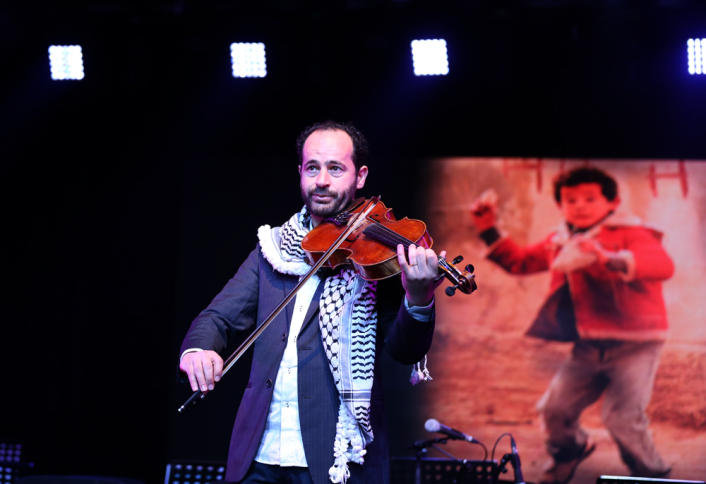 وأشار إلى صورته وهو يحمل الحجارة والتي اشتهرت بغالبية وسائل الإعلام المحلية والدولية، وإلى التحول الذي جرى في مسيرته من ترك المواجهة بالحجارة إلى الموسيقى والعزف على آلة الكمان.