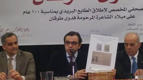 واعلن موسى رسميا اطلاق الطابع لمناسبة مرور مائة عام على ميلاد الشاعرة الراحلة فدوى طوقان، والتعامل به من اليوم عقب التوقيع عليه.
