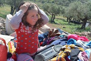 الطفلة ميرا شحيبر (6 سنوات) تقول: "هدموا غرفتي، وبدي أنام تحت الزيتونة، لأنه لم يعد عندي غرفة، ملابسي اتسخت، وقتلوا طير الحمام الذي كنت أطعمه".