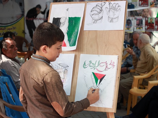 نابلس– زهران معالي- ينشغل الطفل حذيفة سامر (12 عاما)، داخل خيمة التضامن في ميدان الشهداء وسط نابلس، منذ ساعات الصباح، برسم لوحات فنية، تجسد معاناة الأسرى المضربين عن الطعام منذ 16 يوما، في محاولة منه للفت أنظار العالم لمعاناتهم المتفاقمة في سجون الاحتلال الإسرائيلي.