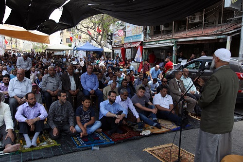 جماهير طولكرم تؤدي صلاة الجمعة في خيمة الاعتصام وسط المدينة
