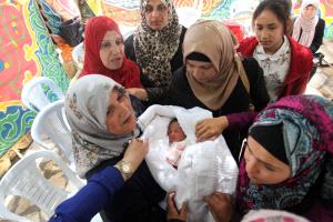 تحملها جدتها بين ذراعيها والدموع في عينيها، لتفتح الطفلة عينيها لأول مرة على الدنيا، في خيمة اسناد ودعم أسرى الحرية، المضربين عن الطعام منذ 32 يوما.