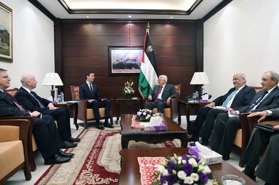 - استقبل رئيس دولة فلسطين محمود عباس، مساء اليوم الأربعاء، بمقر الرئاسة في مدينة رام الله، كبير مستشاري البيت الأبيض جاريد كوشنر، ومبعوث الرئيس الأميركي جيسون جرينبلات.