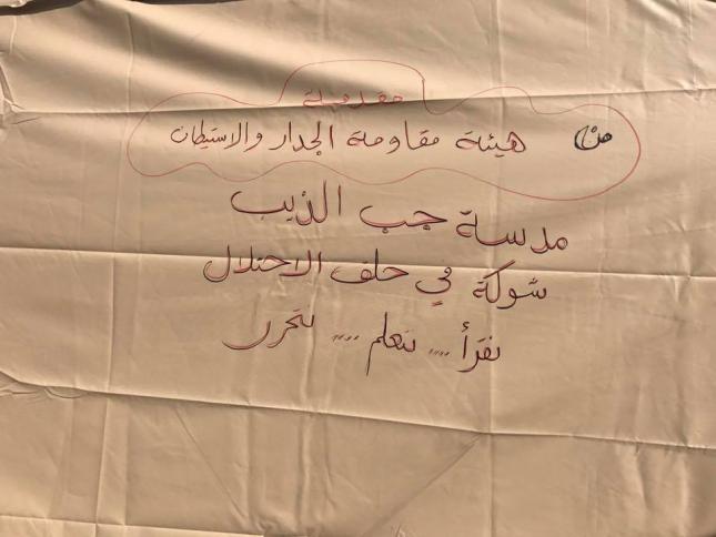 (فدائي فدائي فدائي.... يا أرضي يا أرض الجدود.. فدائي فدائي فدائي .... يا شعبي يا شعب الخلود)، بهذا النشيد الوطني الفلسطيني، افتتح طلبة مدرسة التحدي "5" الأساسية المختلطة في جب الذيب شرق بيت لحم، يومهم الدراسي، عقب اعادة بنائها مجددا، بعد أن هدمها الاحتلال الإسرائيلي في الثاني والعشرين من الشهر الماضي.