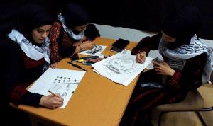 تجتمع ثلاث فتيات في إحدى غرف جامعة القدس المفتوحة، فرع طوباس، لرسم المزيد من اللوحات الفنية للرئيس الراحل، ياسر عرفات، والمشاركة في أحد معارض الصور.