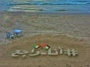 هاشتاق "أنا راجع" وبجوارها علما فلسطين، آخر ما نحته الفنان أبو عمرو (27 عاما) على شاطئ البحر للدلالة على مشاركته في مسيرات العودة التي شهدتها الحدود الشرقية لقطاع غزة يوم الجمعة الماضي.