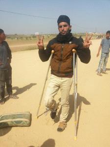 على عكازتين حديديتين يسير محمد أبو عيدة (26 عاماً)، على طول شارع ترابي محاذ للحدود الشرقية لمدينة غزة للمشاركة في فعاليات "مسيرة العودة" التي انطلقت في الثلاثين من الشهر الماضي.