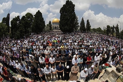 فيما اكتظت مساجد الأقصى المسقوفة وباحاته وأروقته والمنطقة المشجرة بعشرات الآلاف من المصلين من القدس والداخل الفلسطيني والضفة الغربية والمئات من المسلمين من دول عربية وأجنبية.
