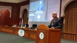 وأضاف: "ان هذه الأهمية التي نـوليها لفلسطين، ولعاصمتها القدس الشريف، والجهود المتواصلة التي نبذلها، هي مصدر اعتـزاز لنا، وفـاءً لها، وأداءً لواجباتها علينا، وتعبيرا عن ارتباطنا بها باعتبارها أهـم قضايا العالم الإسلامي التي من أجلها تأسست منظمة التعاون الإسلامي غداةَ انعقاد مؤتمر القمة الإسلامي الأول هنا في الرباط عاصمة المملكة المغربية قبل تسع وأربعين سنة"، وأعلن أن القدس مسؤولية مقدسة في أعناقنا نتحمّلها جميعا دون استثناء، وأن فلسطين أمانة غالية لن نفـرّط فيها مهما تكن التحدّيات التي نواجهها، ولفت إلى أنَّ اختيار هذا الوقت العصيب حيث تَـتَـصَاعَـدُ موجة التحدّيات التي تواجه القضية الفلسطينية، وتَـتَـفَـاقَـمُ التهديدات التي تحاصر القدس الشريف من كل جانب، لتكريم المدير العام للإيسيسكو بوسام نجمة الاستحقاق لدولة فلسطين، يعبر أقـوى ما يكون التعبير، عن التقدير العميق الذي تكنّـه القيادة الفلسطينية لمنظمة الإيسيسكو، ولمديرها العام الذي قال إنه يواصل القيام بمهامه ومسؤولياته في خدمة العمل الإسلامي المشترك، والدّفاع عن حـقّ الشعب الفلسطيني في مواجهة الاحتلال الإسرائيلي الغاشم، ودعم المؤسسات الثقافية والتربوية والعلمية في فلسطين.