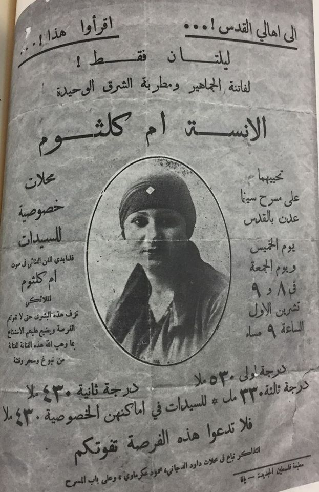 وحين نسمع عن عمالقة الفن الراقي، نجد أن بداياتهم كانت من فلسطين، وخاصة من القدس وحيفا ويافا، التي كانت مزدهرة اقتصادياً، فبدأت هذه المدن بإقامة الحفلات الغنائية ومجالس الطرب، حتى أصبح الهواة والمطربون يتوافدون اليها بشكل منتظم، مثل محمد عبد الوهاب، وسامي الشوا، أمير الكمان العربي، ومنيرة المهدية، وكذلك أم كلثوم التي لقبت بـ«كوكب الشرق» في حيفا.