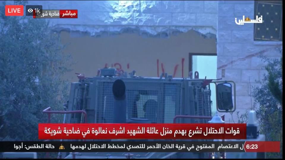 هدمت قوات الاحتلال الإسرائيلي، اليوم الاثنين، منزل ذوي الشهيد أشرف نعالوة في ضاحية شويكة شمال طولكرم، مستخدمة جرافة عسكرية، ومطارق يدوية.