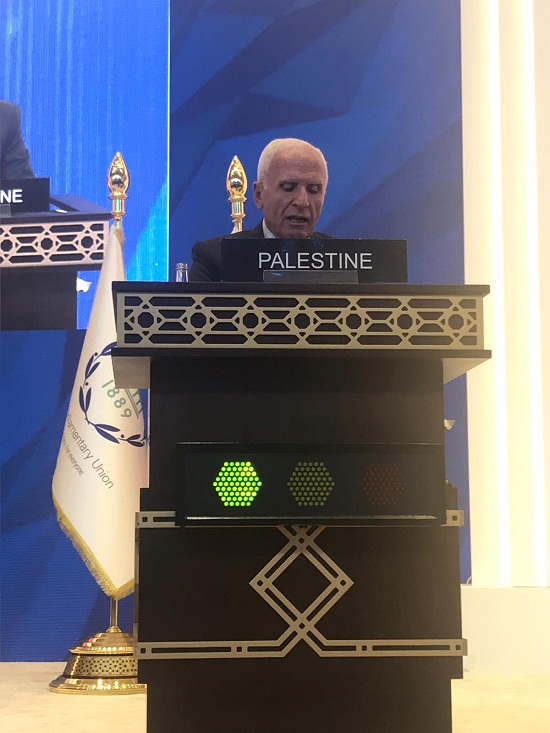 طالب رئيس وفد المجلس الوطني لاجتماع لجنة الشرق الأوسط التابعة للاتحاد البرلماني الدولي عزام الأحمد، بتوفير الحماية الدولية لشعبنا وتنفيذ قرارات الشرعية الدولية التي تنص على إنهاء الاحتلال الإسرائيلي لدولة فلسطين.