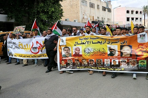 وتخلل المسيرة والمهرجان هتافات للمشاركين الذين رفعوا الأعلام الفلسطينية وصور للأسرى وشعارات تضامنية تطالب بالتدخل للإفراج عنهم، وتندد بسياسات الاحتلال بحقهم.