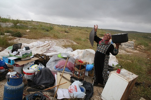 "من هالمراح ما في رواح، هاي أرضي بدي اضل في شمسها ما برحل عنها"، عبارات رددتها الحاجة بسمة النواجعة، وهي تلملم ما تبقى من حاجياتها، بعد أن هدم الاحتلال الخيمة التي تؤويها للمرة الرابعة خلال شهر، في قرية سوسيا بمسافر يطا جنوب الخليل.