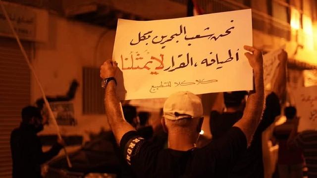 تظاهرات في المنامة تنديدا باتفاق التطبيع مع دولة الاحتلال الأخبـــــــار 2020-09-13 | 09:40 3735 المنامة- جابت مسيرات حاشدة، الليلة الماضية، وسط العاصمة البحرينية المنامة، تنديدا باتفاق التطبيع البحريني مع دولة الاحتلال الإسرائيلي، برعاية أميركية. ورفع المشاركون الأعلام الفلسطينية، مرددين هتافات منددة بالتطبيع، واصفين الاتفاق "بالجريمة والخيانة بحق فلسطين والمسجد الأقصى المبارك". kh