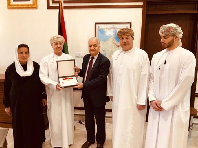 ونيابة عن الرئيس، سلم سفير دولة فلسطين لدى سلطنة عُمان تيسير جردات، الوسام، إلى ذوي الفقيد، في مقر السفارة اليوم الأحد، تقديرا لمسيرته التعليمة التربوية الرائدة، التي رفعت اسم فلسطين عاليا، وتركت بصماتها في مجال النهضة التعليمية في سلطنة عُمان، وتثمينا لعطائه الذي حظي بثقة وتقدير الشعب العُماني ومسؤوليه.