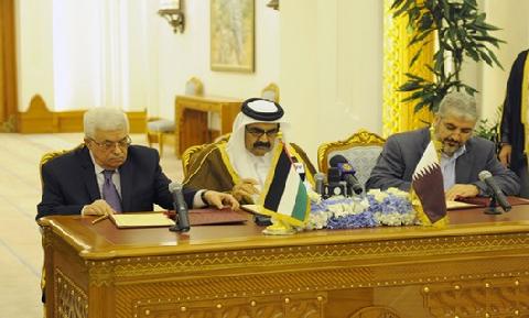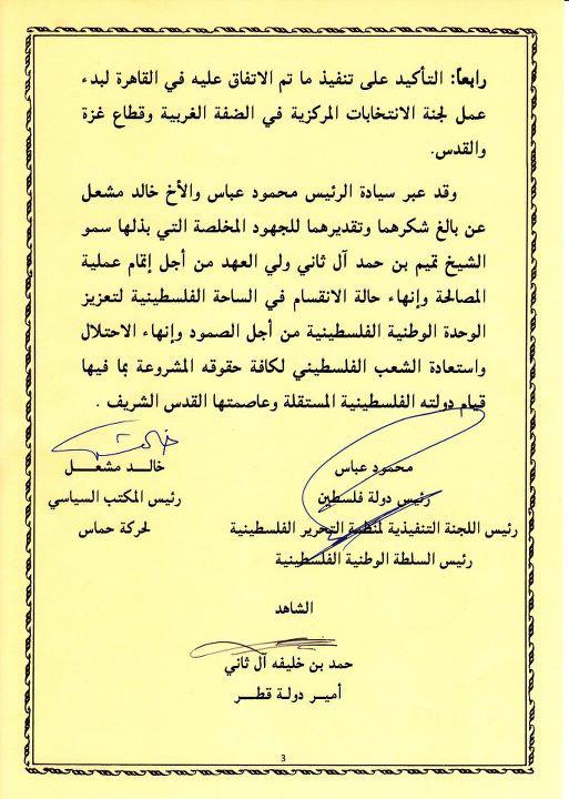 وقد عبر سيادة الرئيس محمود عباس والاخ خالد مشعل عن بالغ شكرهما وتقديرهما للجهود المخلصة التي بذلها سمو الشيخ تميم بن حمد آل ثاني ولي العهد من أجل اتمام عملية المصالحة وانهاء حالة الانقسام في الساحة الفلسطينية لتعزيز الوحدة الوطنية الفلسطينية من أجل الصمود وانهاء الاحتلال واستعادة الشعب الفلسطيني لكافة حقوقه المشروعة بما فيها قيام دولته الفلسطينية المستقلة وعاصمتها القدس الشريف".