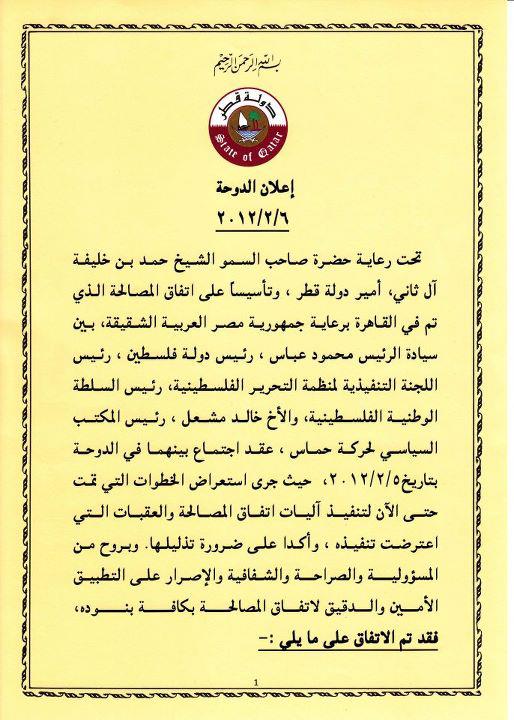 "تحت رعاية حضرة صاحب السمو الشيخ حمد بن خليفة آل ثاني أمير دولة قطر، وتأسيسا على اتفاق المصالحة الذي تم في القاهرة برعاية جمهورية مصر العربية الشقيقة، بين سيادة الرئيس محمود عباس، رئيس دولة فلسطين، رئيس اللجنة التنفيذية لمنظمة التحرير الفلسطينية، رئيس السلطة الوطنية الفلسطينية، والاخ خالد مشعل رئيس المكتب السياسي لحركة حماس عقد اجتماع بينهما في الدوحة بتاريخ الخامس من شباط/فبراير 2012 حيث جرى استعراض الخطوات التي تمت حتى الآن لتنفيذ آليات اتفاق المصالحة والعقبات التي اعترضت تنفيذه، وأكدا على ضرورة تذليلها.