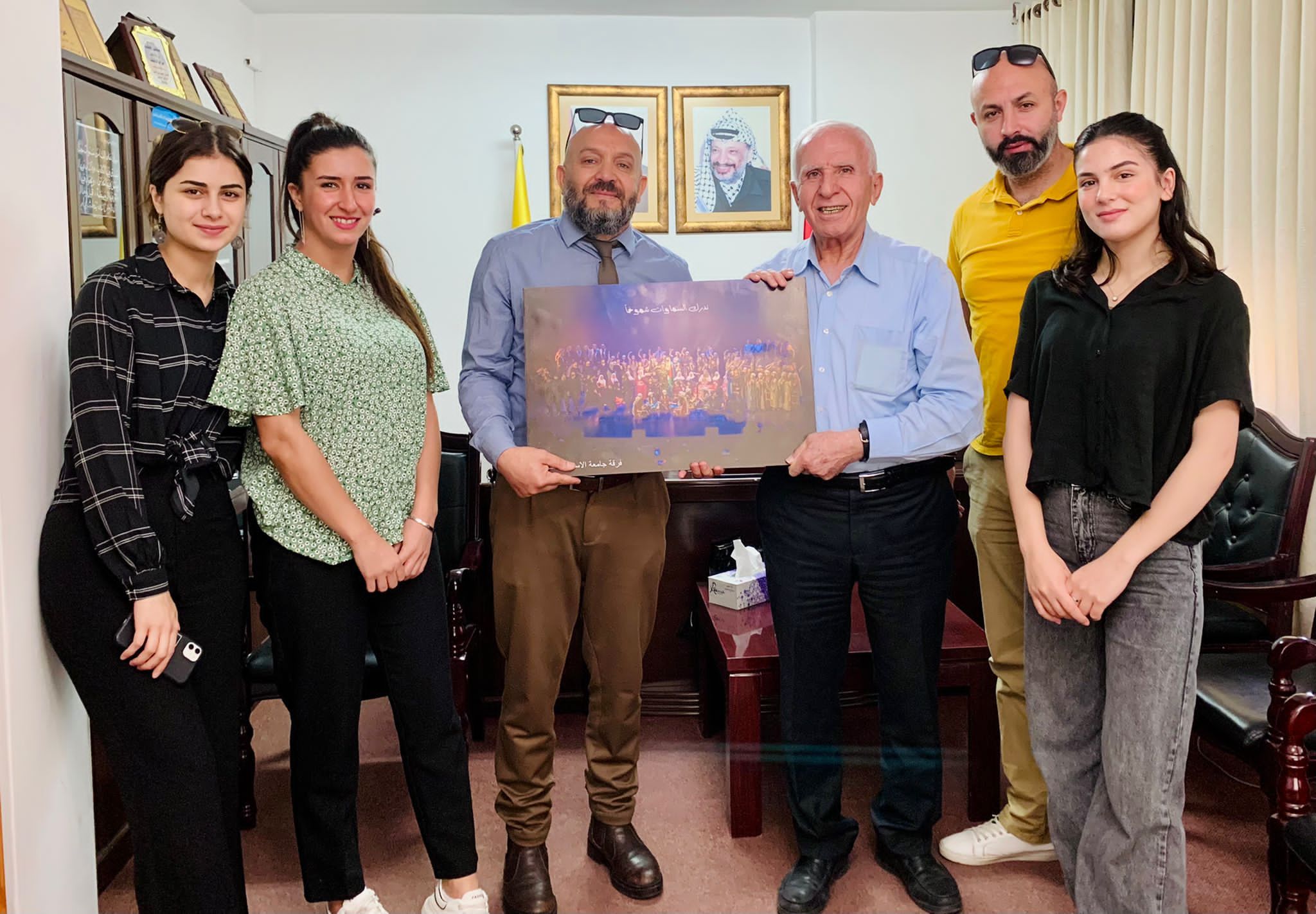رام الله- أهدت فرقة الفنون الشعبية في جامعة الاستقلال عضو اللجنتين التفيذية لمنظمة التحرير والمركزية لحركة فتح- مفوض العلاقات الوطنية، وعضو مجلس الامناء في الجامعة عزام الأحمد صورة تذكرية تضم اعضاء الفرقة على المسرح، وذلك تقديراً لدوره واعضاء مجلس امناء الجامعة في دعم استمرارية عطاء الفرقة .