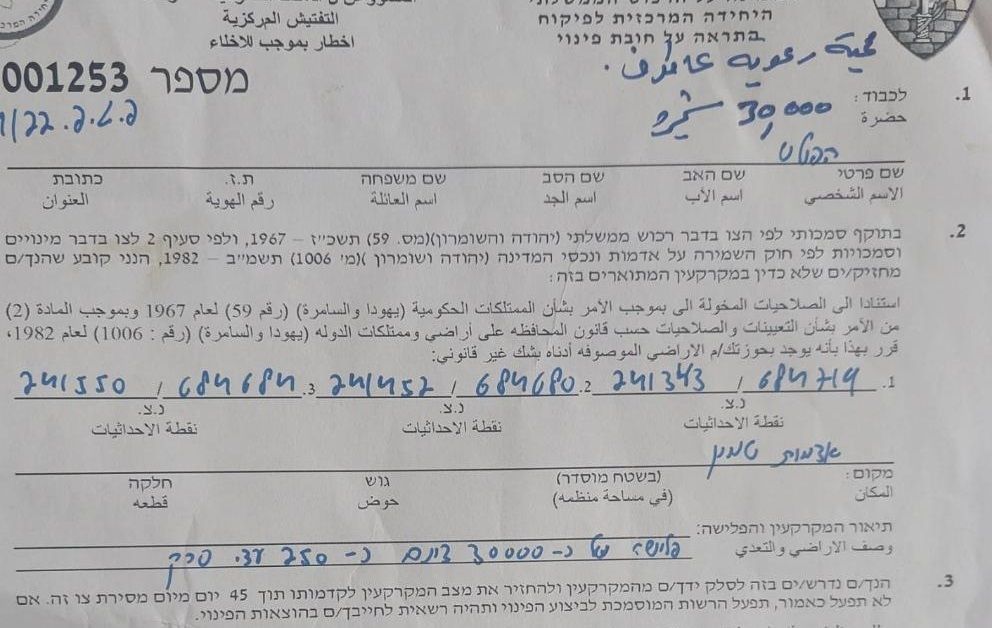 وأوضح أنه تم العثور على الإخطار داخل الأرض اليوم، علما أن التاريخ المدون عليه هو 6-10-2022، مبينا أن سلطات الاحتلال تضع الإخطارات داخل الأراضي دون تسليمها مباشرة، وعادة يعثر عليها المواطنون خلال عملهم في الأراضي.