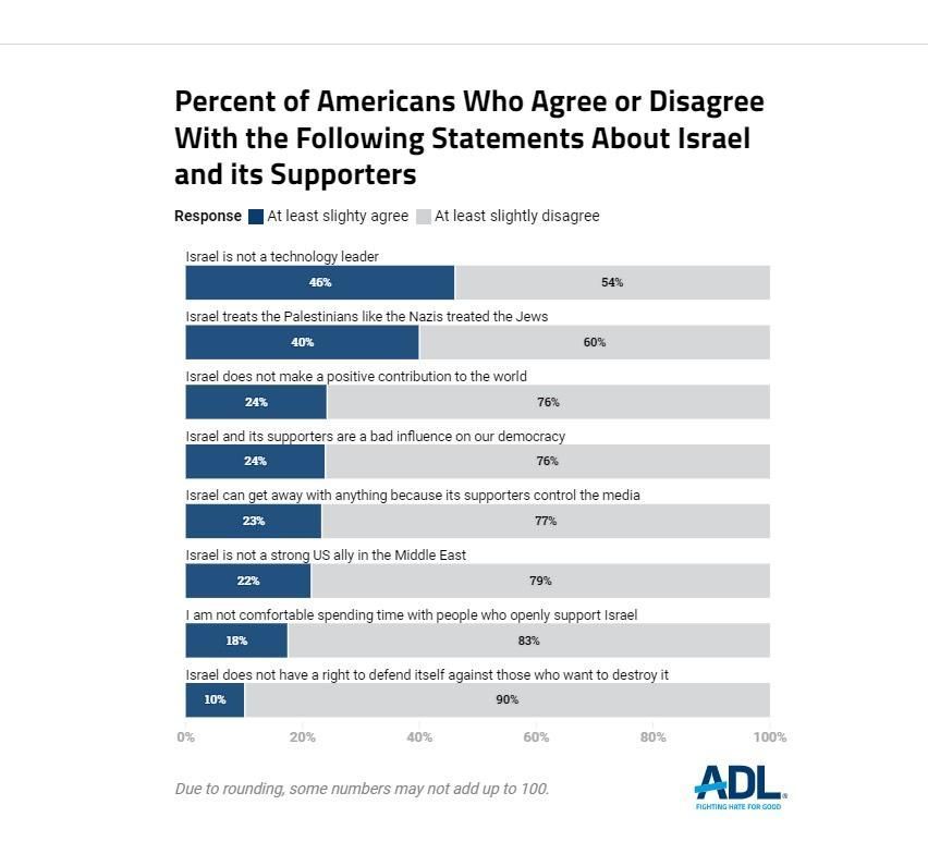 وحسب مركز ADL الذي أصدر الاستطلاع، فإن اسرائيل مختلطة منذ البداية في التفريق بين معاداة السامية وكيفية تعريف ذلك، وأن اليهود أكثر ولاءً لإسرائيل من الولايات المتحدة، وان لهم تأثيراً كبيراً على عالم الاعمال في وول ستريت (مركز المال العالمي) ولديهم الكثير من القوة في امريكا.
